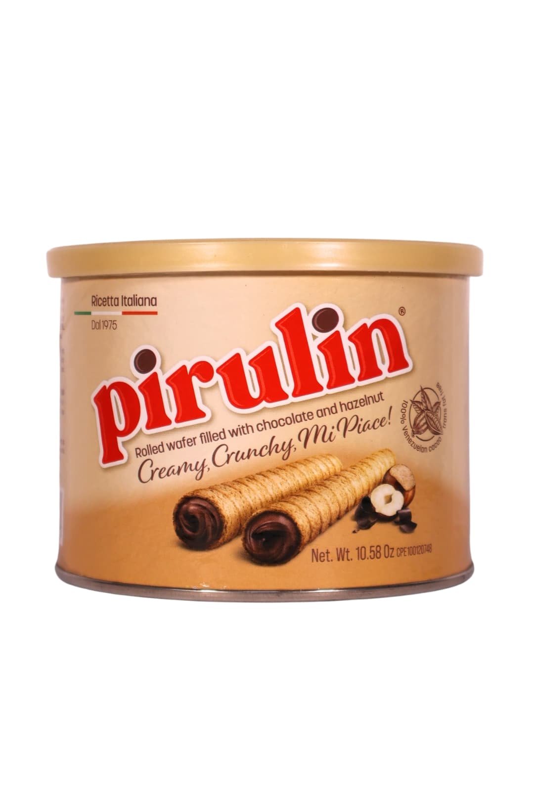 Icónica barquilla venezolana con forma cilíndrica, caracterizada por su textura crujiente y un cremoso relleno de avellana y cacao venezolano